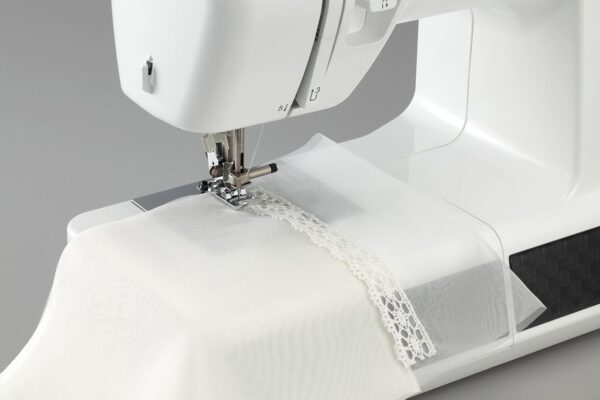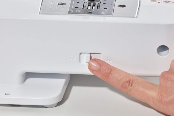 - Système d’enfile-aiguille, abaissement des 6 griffes d’entraînement pour la couture libre, réglage de la longueur (4 mm) et de la largeur (7 mm), réglage manuel de la tension du fil.