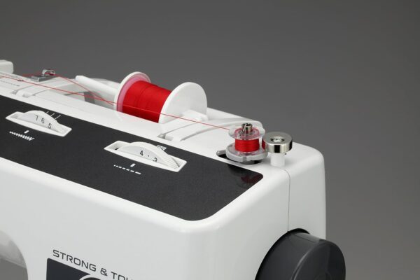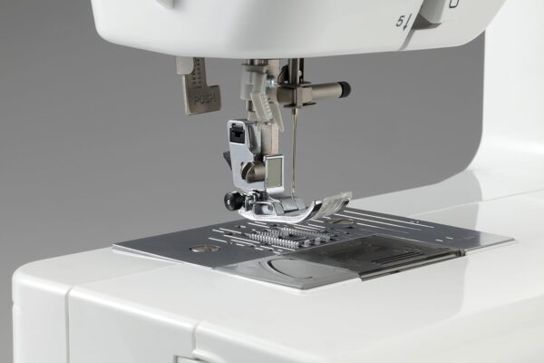 - Poignée de transport intégrée, livrée avec 6 pieds de biche dont 1 pied zig-zag avec goupille pour un passage plus aisé des épaisseurs et 1 pied anti-adhérent pour les matières délicates.