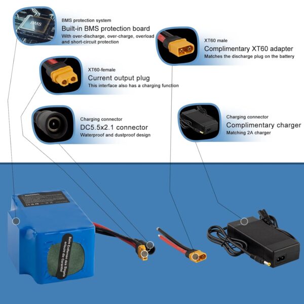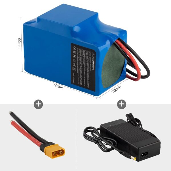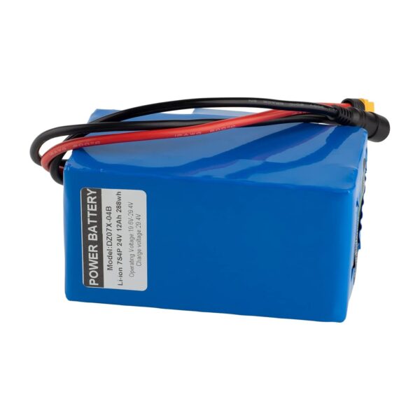 - [– Paramètres du produit –] batterie lithium – ion 24V 12ah. Taille 140x90x70mm. Convient aux moteurs de 700w (50W – 700w). Courant de décharge constant maximal: 30A. Durée de vie supérieure à 1000 fois. Équipé d’un chargeur 2a 29,4v. Connecteur standard avec prise xt60.