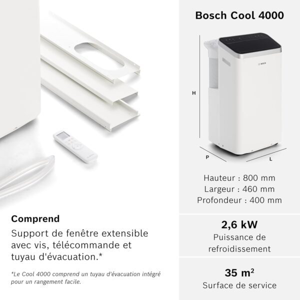 Bosch Cool 4000 Portable AC – 3 en 1 Climatiseur, Déshumidificateur, Ventilateur – 2,6 kW pour les pièces jusqu’à 35m² – Avec Mode Auto, Mode Silencieux et Mode Veille (48 db (A)) [Classe A+]