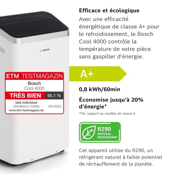 - Refroidir en Toute Simplicité : Le climatiseur mobile Bosch vous garde concentré, reposé et détendu pendant la saison chaude. Profitez du confort dans votre salon, chambre ou bureau à domicile