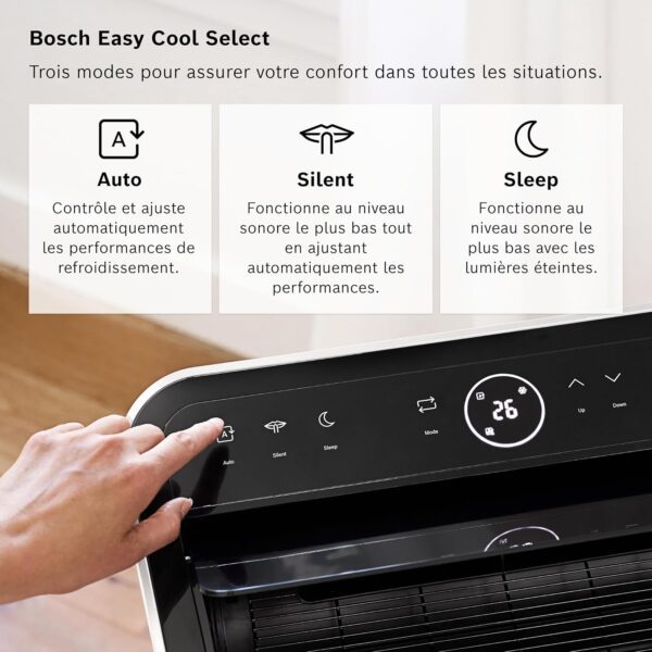 - Bosch Easy Cool Select : Grâce aux modes préprogrammés (Mode Auto, Mode Silencieux, Mode Sommeil), vous pouvez ajuster les performances de votre unité de climatisation en un seul clic