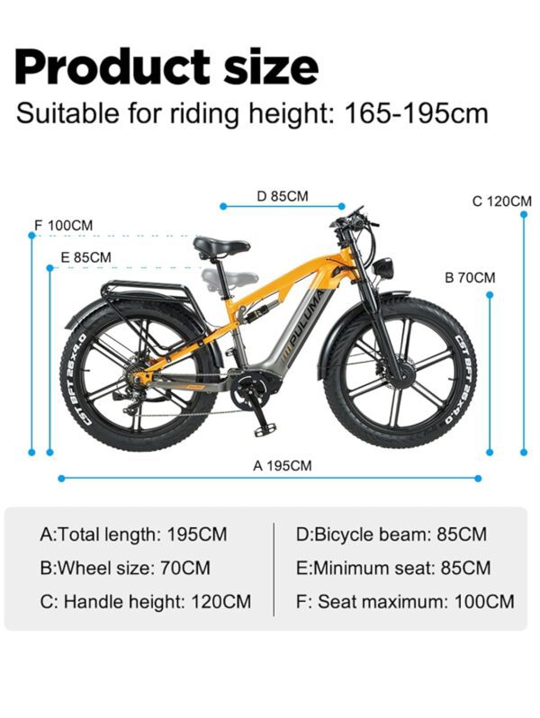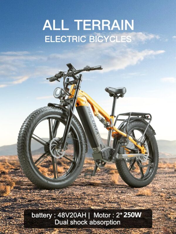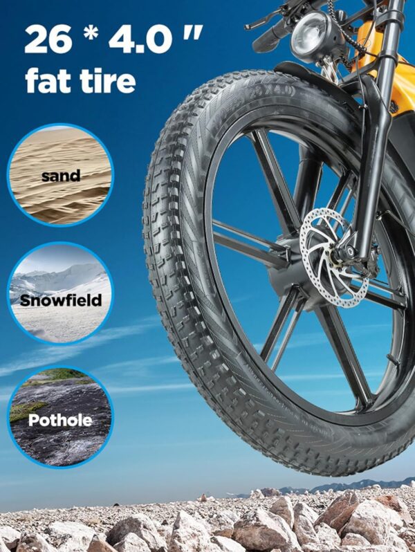 - 【Comfort et sécurité】 : le vélo électrique est équipé de gros pneus de 26*4,0 pouces, qui peuvent rouler sur n’importe quel terrain accidenté tel que la neige, la plage, la montagne, les routes urbaines, etc., réduisant ainsi le danger d’un terrain compliqué ; le système de suspension double (fourche avant et amortisseur arrière) peut réduire les bosses sur la route