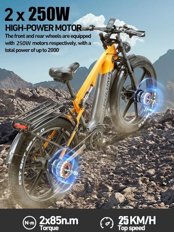 - 【Deux moteurs】: cet ebike est équipé de deux moteurs sans balais en alliage de magnésium, avec une puissance totale de 250W (pic 2000), fournissant une double puissance, un angle de montée jusqu’à 45°, un entraînement à deux moteurs et un entraînement à un seul moteur commutable, une vitesse maximale de 25KM/H (si vous avez besoin d’une vitesse plus rapide, veuillez nous le faire savoir) ; Équipé du système de changement de vitesse SHM à 7 vitesses, la conquête des pentes raides devient très facile, et vous êtes en mesure d’explorer plus de nouveaux endroits.
