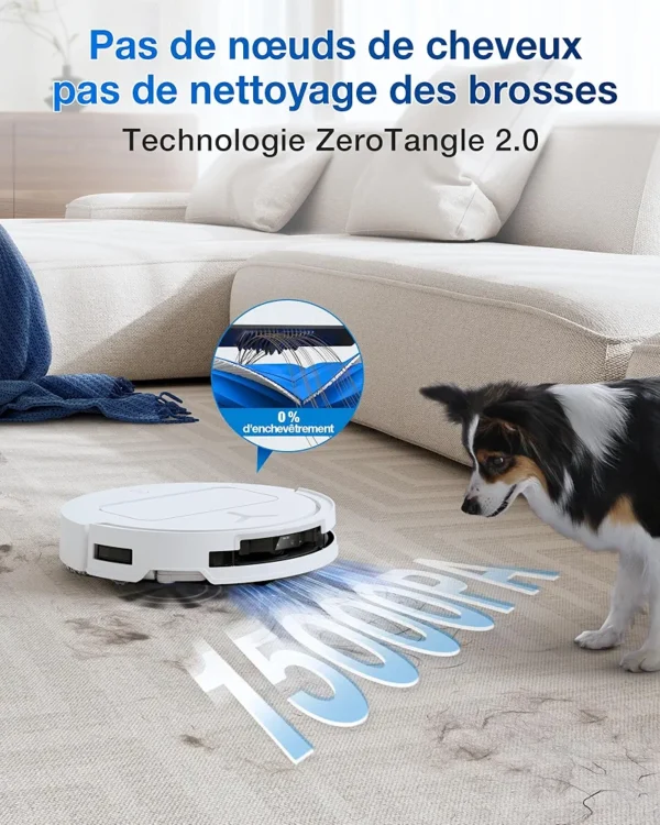 - 【Puissance d’aspiration de 15 000 Pa et ZeroTangle 2.0】DEEBOT T50 offre une aspiration puissante de 15 000 Pa qui dévore la saleté et les débris comme un ouragan. La technologie ZeroTangle 2.0, dotée de structures en triple V, rassemble, soulève et démêle activement les cheveux, garantissant un taux d’enchevêtrement aussi bas que 0 %, même avec des cheveux longs.