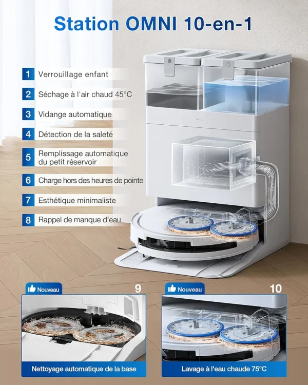 - 【Station OMNI tout-en-un】La station OMNI tout-en-un offre des fonctionnalités avancées, notamment le vidage automatique et le séchage à l’air chaud à 45 °C. Avec des grattoirs bidirectionnels et un lavage à l’eau chaude à 75 °C, il nettoie automatiquement la serpillère et la base grâce à l’autonettoyage automatique.