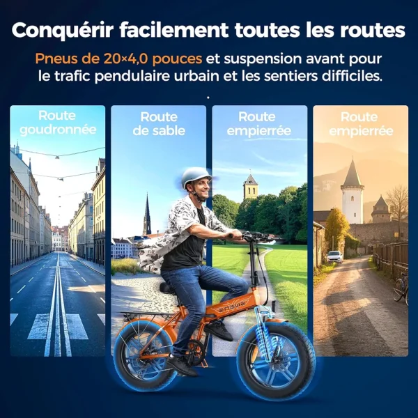 - Conduite souple et confortable : Le vélo électrique ENGWE EP-2 BOOST est équipé d’un capteur de couple pour une conduite souple et silencieuse. Le cadre en aluminium 6061, la fourche à suspension avant et la selle et le guidon réglables offrent une conduite souple et confortable à toutes les hauteurs, tandis que les roues en aluminium de 20 pouces s’adaptent à tous les terrains pour plus de stabilité et de polyvalence.