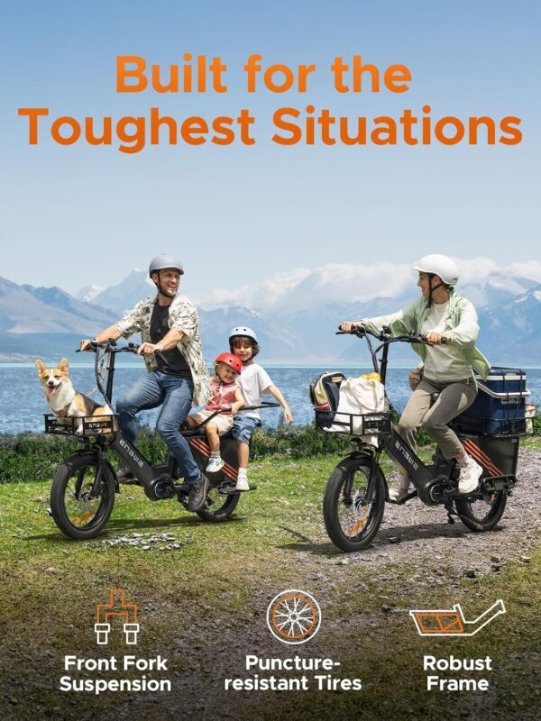 - ★Un Cargoebike résout tous les besoins de voyage : Le vélo électrique Cargo-Ebike peut transporter 200 kg et dispose d’un porte-bagages allongé pour obtenir des fonctions de chargement multifonctionnelles au lieu d’une voiture ; le panier avant et arrière en option, la barrière arrière rabattable, le dossier arrière, le repose-pieds arrière rabattable et le siège bébé vous offrent une multitude de possibilités.