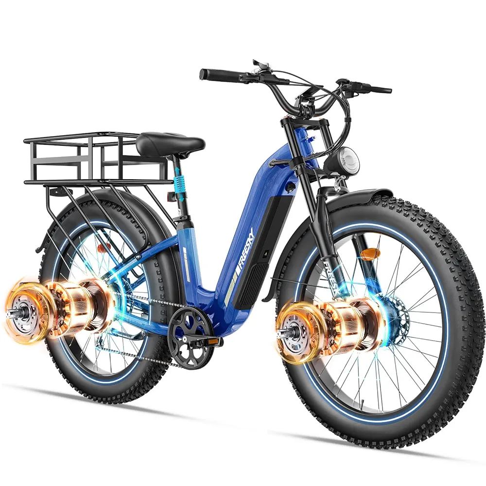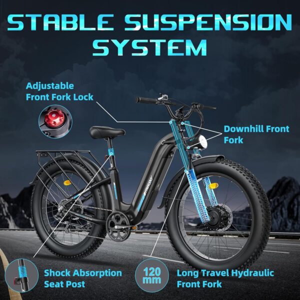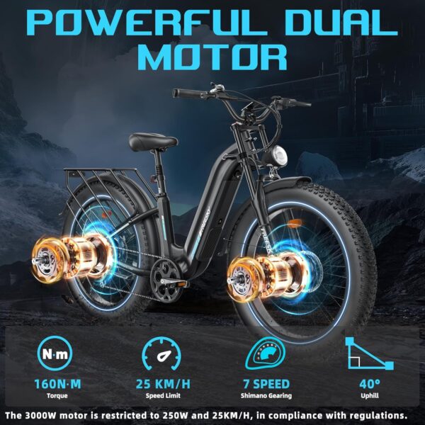 - 🚀2 MOTEURS HAUTE PERFORMANCE – Avec sa double motorisation haute performance, ce vélo électrique délivre un couple exceptionnel de 160 Nm, lui permettant de gravir sans effort des pentes abruptes jusqu’à 40º. Parfaitement adapté aux terrains les plus exigeants, il est votre allié idéal pour conquérir sentiers escarpés, chemins de montagne et parcours hors-piste avec une puissance inégalée.