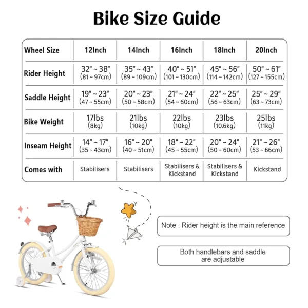- 【Por favor, compruebe el tamaño】- La bicicleta de 12” está diseñada para niños de 1 a 4 años o 32-38 pulgadas de altura, la bicicleta de 14” está diseñada para niños de 3 a 5 años o 35-43 pulgadas de altura, la bicicleta de 16” es para niños de 4 a 8 años o 40-51 pulgadas de altura, la bicicleta de 18” es para niños de 5 a 9 años o 45-56 pulgadas de altura, la bicicleta de 20” es para niños de 6 a 12 años o 49-61 pulgadas de altura.