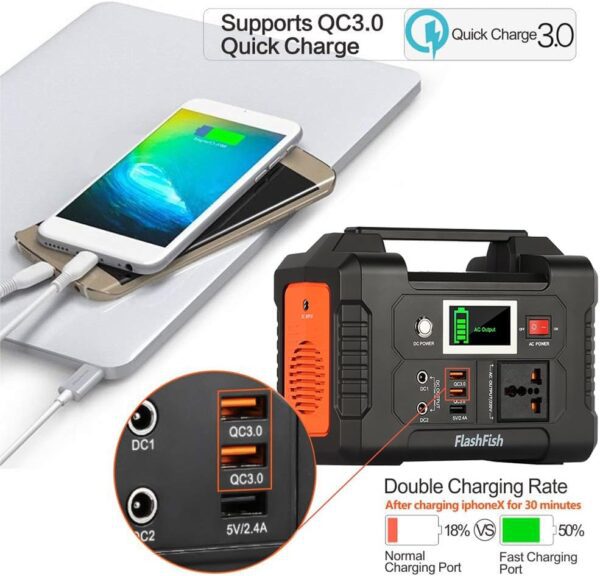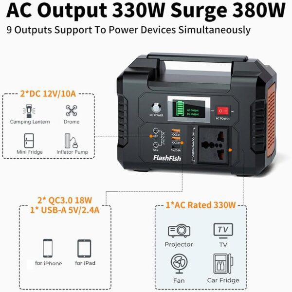 【Large application】 La centrale électrique portable peut fournir suffisamment d’énergie pour les petits utilisateurs finaux, tels que : smartphone/tablette/ordinateur portable/appareil photo/lumière/drones/ventilateurs/appareils de voiture/mini-réfrigérateur ou autres petits appareils électriques.