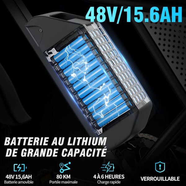 - 【Charge Rapide et Batterie Amovible et Verrouillable】Vélo Électrique Ridstar Q20 Mini équipée batterie lithium-ion 48V 15.6 Ah pour une plus grande capacité ; batteries approuvées UL avec BMS et protection contre la surcharge pour une sécurité accrue ; conception amovible pour une charge plus facile ; technologie de charge rapide, temps de charge de 4 à 6 heures. Les batteries sont également conçues pour être antivol, ce qui permet de les verrouiller et de les déverrouiller rapidement à l’aide de la seule clé fournie.