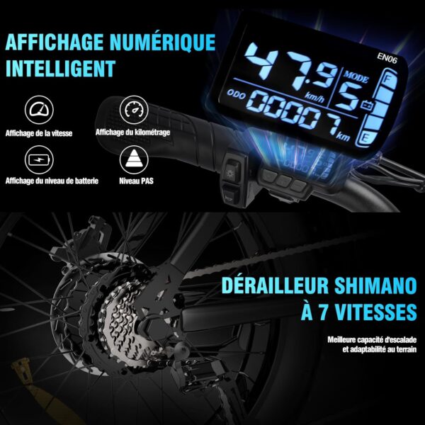 - 【Confort et Durabilité】Cadre en acier à haute teneur en carbone plus durable, sac de cadre étanche supplémentaire et support de téléphone portable avec port de charge USB. L’écran LCD affiche la vitesse, le kilométrage, la batterie et d’autres informations, pour votre confort de conduite. Le poids du vélo est de 30 kg, la taille recommandée est de 163-193 cm, la capacité de charge maximale est de 150 kg.