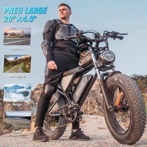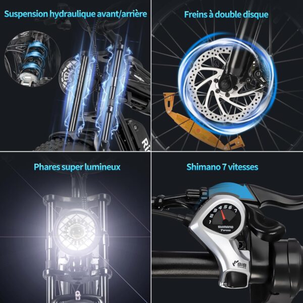 - 【Pneus Gras 20” et 7 Vitesses et Double Suspension】Vélo Électrique Ridstar Q20 Mini équipé 20×4,0 pouces sont antidérapants et anti-crevaison, ne craignant pas les montagnes, le sable, les routes de gravier, la neige et ainsi de suite.La transmission à 7 vitesses de qualité professionnelle s’adapte aux différents terrains ; les doubles freins à disque, la double suspension hydraulique et l’EABS vous offrent toujours une capacité de freinage et une absorption des chocs fiables, garantissant votre sécurité et votre confort sur tous les types de surfaces routières. Le phare avant LED super lumineux et le feu arrière d’avertissement de freinage garantissent une conduite sûre la nuit.