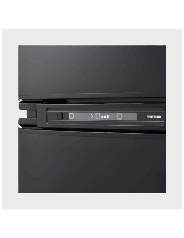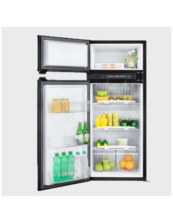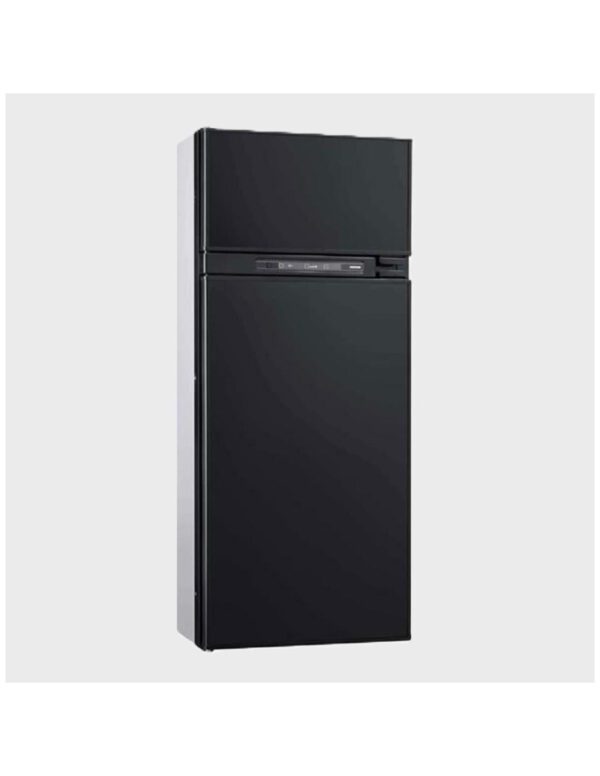 Réfrigérateur à absorption deux portes d’une capacité de 141 litres (réfrigération) et 23 litres (congélateur). Ce réfrigérateur à absorption polyvalent fonctionne sur trois sources d’alimentation différentes : batterie du véhicule, gaz ou secteur (220 V). Il sélectionne automatiquement la source d’alimentation la plus adaptée, mais l’utilisateur peut également la choisir manuellement grâce à l’écran LED du panneau de commande. Ce modèle N4145E+ possède une porte noire mate à cadre plat (10 mm d’épaisseur) avec charnière à gauche, facilement réversible à droite. Le joint d’étanchéité de la porte garantit sa fermeture même lorsque le véhicule est en mouvement. Le réfrigérateur est équipé de trois clayettes de porte, ainsi que de trois autres clayettes et de deux compartiments pour les légumes et les salades. Panneau de commande : LED – Dimensions : 1245 (hauteur) x 525 (largeur) x 543 mm (profondeur) – Indication du type de porte : Gauche (mais peut être convertie à droite) Consommation d’énergie* : 4,0 kWh/24h – Consommation d’énergie gaz* : 420 g/24h – Sélection de l’énergie (ou sélection de l’alimentation) : Automatique * Consommation d’énergie moyenne à une température ambiante de 25 °C.