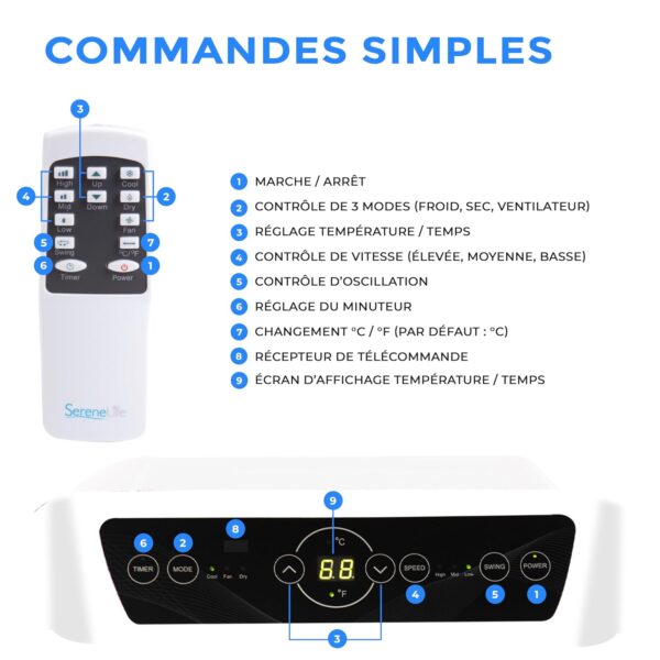 • TÉLÉCOMMANDE : Ce Climatiseur mobile avec evacuation est doté d’un panneau de commande numérique à boutons tactiles qui comprend les réglages de mise en marche, de mode, de minuterie, de température et de vitesse du ventilateur. D’autres fonctions telles que le sélecteur d’unité (Celsius / Fahrenheit), la touche de sommeil peuvent être ajustées à l’aide de la télécommande incluse.