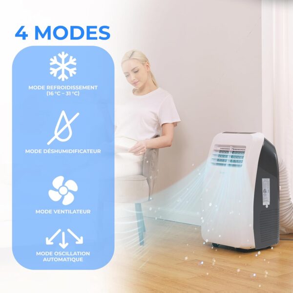 • 3 MODES DE FONCTIONNEMENT : Ce rafraichisseur d’air silencieux compacte pour sol dispose d’un fonctionnement simple par branchement électrique et propose 3 modes – refroidissement, déshumidificateur et ventilateur. Ce clim mobile dispose également d’un mode oscillant automatique avec une buse de ventilation mobile pour une circulation d’air maximale.