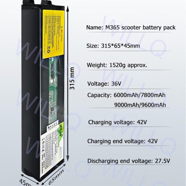 - Batterie de 36 V pour trottinette électrique, 6 Ah, 7,8 Ah, 9 Ah et 9,6 Ah. Dimensions : 315 x 65 x 45 mm. Accessoire de remplacement pour batterie de trottinette M365. Port : XT60 + JST